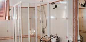 Ampia camera matrimoniale e bagno privato con box doccia. Accesso dalla sala colazione.